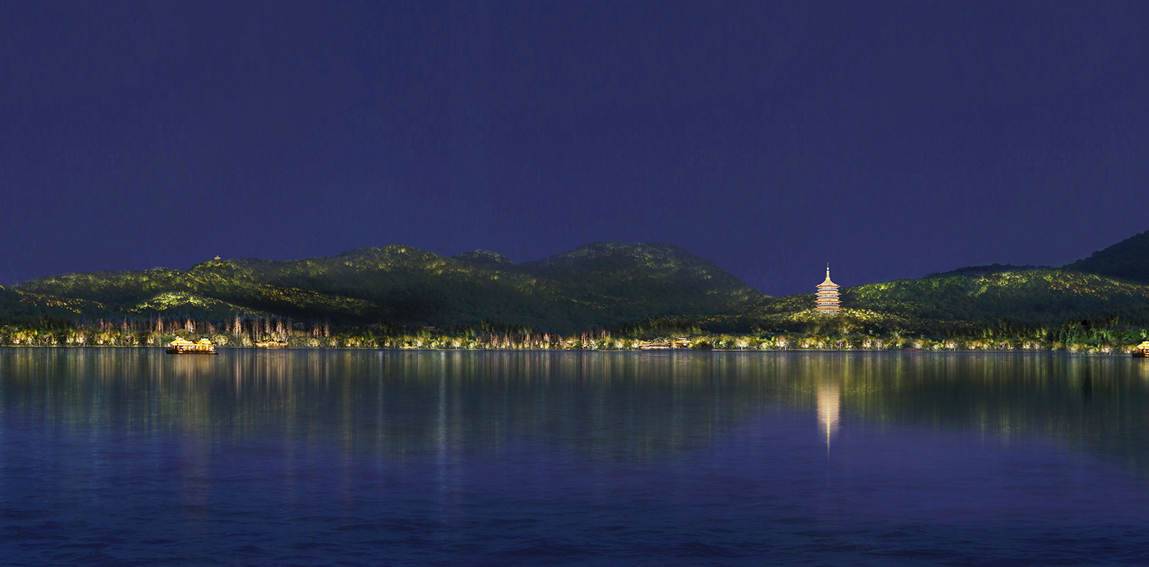 西湖南延線的山體作為G20晚會舞臺大背景,以最優雅的姿態呈現出西湖沿線自然與現代完美融合的別樣風景。 作為西湖南延線夜景觀亮燈工程的主要設計施工方,參與完成了從吳山、玉皇山、九曜山,到西子國賓館主通道、南屏山、夕照山,加上萬松書院的云居山、九華山等亮燈工程。其中“吳山亮燈工程”榮獲杭“G20”專項景觀照明一等獎,柏年公司榮獲G20峰會亮化服務先進集體和服務保障杭州G20優秀施工企業。