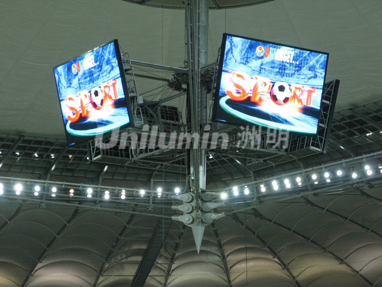 場(chǎng)上的比賽扣人心弦,場(chǎng)下的觀眾同樣也是屏住呼吸,生怕漏看其中任何一個(gè)精彩細(xì)節(jié),位于體育場(chǎng)球場(chǎng)的正上方安裝的四塊LED全彩顯示屏,在這場(chǎng)比賽現(xiàn)場(chǎng)直播上扮演了重要角色,這四塊LED顯示屏分別朝向四個(gè)方向,給球迷觀眾提供全景多角度的賽事直播畫(huà)面,并且刷新率高,采用了高刷驅(qū)動(dòng)芯片,畫(huà)面清晰度高,在顯示過(guò)程中不會(huì)出現(xiàn)掃描線,支持電視臺(tái)現(xiàn)場(chǎng)直播,畫(huà)面色彩保持一致性。