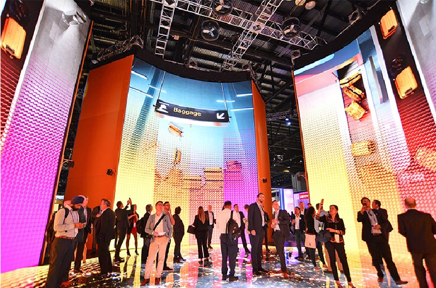 中央展示區的周圍由三面洲明ROE系列Carbon LED顯示屏搭建而成的巨大弧形視頻墻組成,與酷炫LED地磚屏相結合,在LED大屏自身出色的顯示效果基礎上,打造出立體感十足的現場氛圍,沉浸式的大屏體驗吸引了在場眾多嘉賓的駐足。