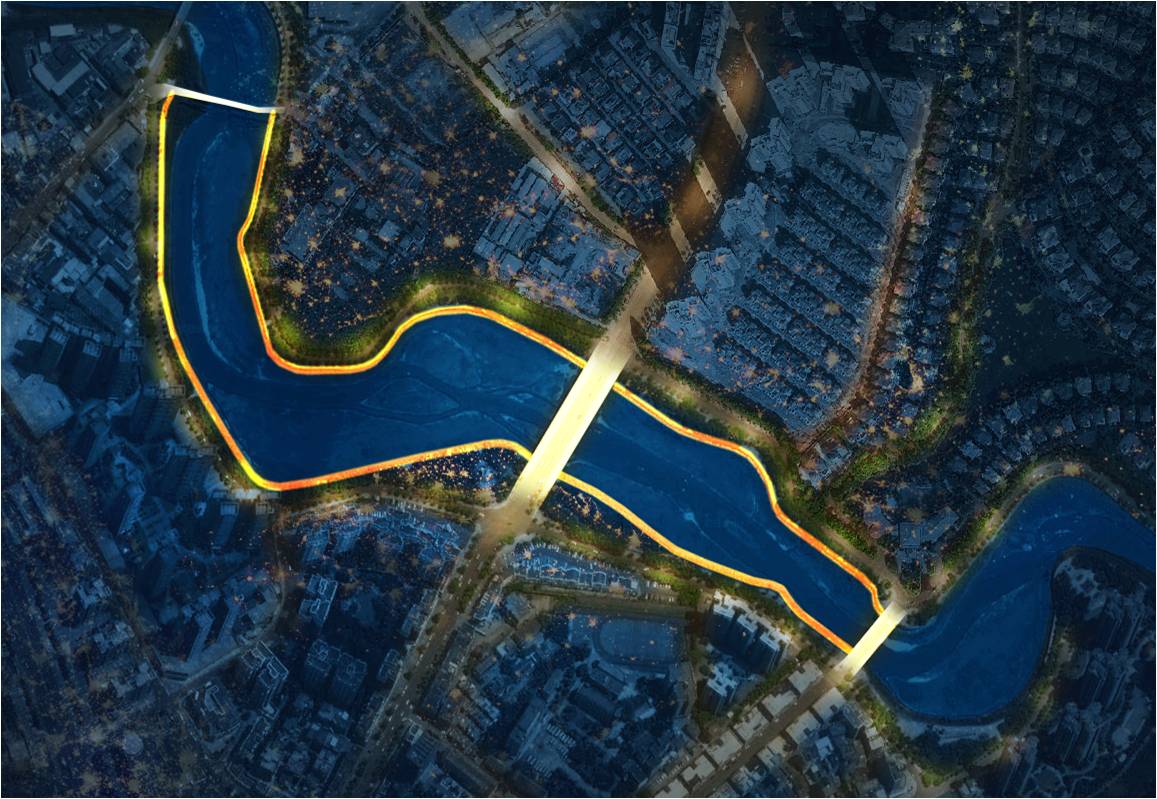 本次石馬河中心段文創燈光項目分為橋梁、兩岸河堤(第一階段項目)和沿河公園(第二階段項目,為配合沿河景觀改造延后施工)兩個部分。其中,橋梁、兩岸河堤部分設計包含“一河、兩岸、三橋”,分別為臥龍橋、永盛北大橋、永和橋及兩岸河堤。