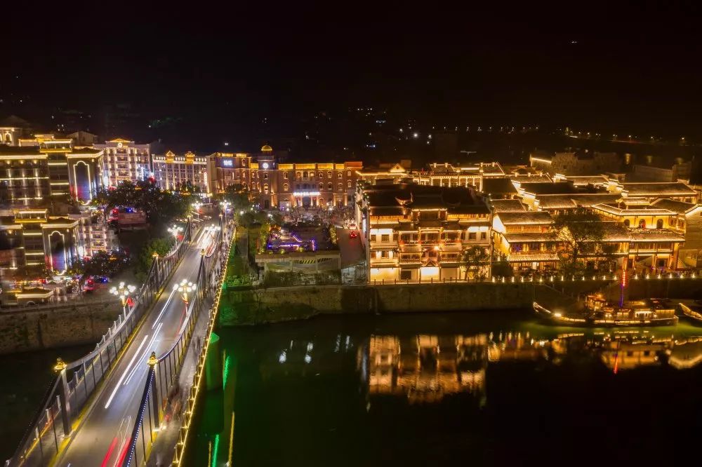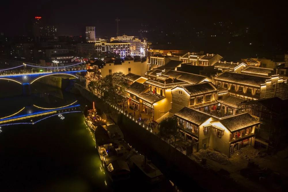 精致的木雕和房屋飛揚(yáng)的翹腳構(gòu)成了典型的具有沅湘特色的江南民居圖。“人向階梯時(shí)上下,屋隨山勢自高低。”在高低錯落、左拐右彎、曲折蜿蜒中,可享受到音樂般起伏的節(jié)奏。溫暖的燈光描繪出一副明清民國市井生活的風(fēng)情畫。