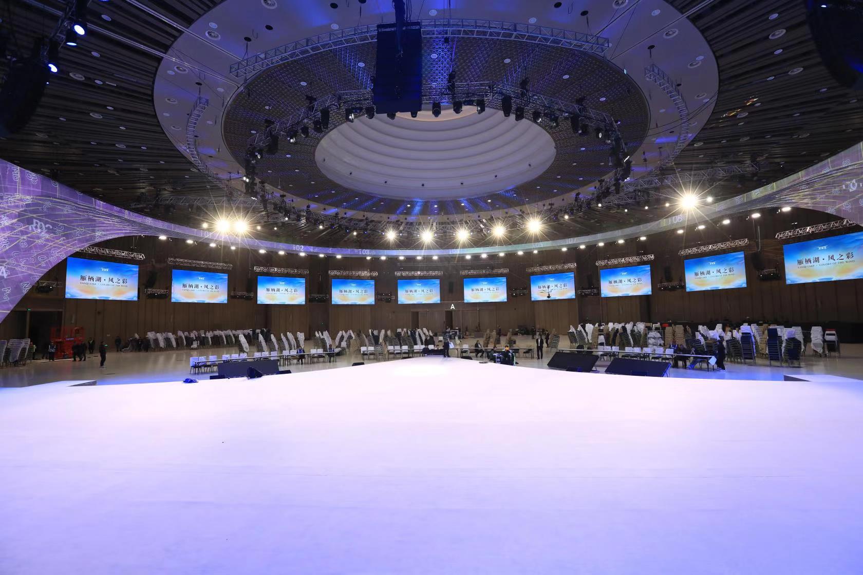安裝完成的弧形大屏和12塊環場顯示屏,顯示畫面高清細膩,視角寬宏廣闊,瞬間成為雁棲湖國際會展中心的視覺焦點,也將成為為期7天的雁棲湖企業家論壇的呈現載體,助推新商業文明的建設,將中華文化的力量傳遞給更多的人!