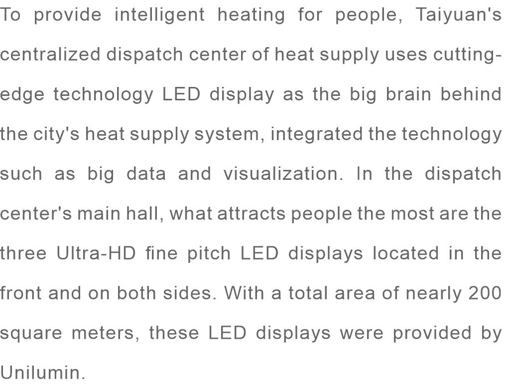 以LED顯示屏為大數據交互核心終端,太原市集中供熱調度中心已成為供熱系統的 “最強大腦”、“神經中樞”,為供暖工作提供了數字化新樣板。