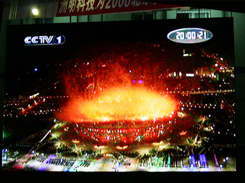 2008年8月8 日晚8點(diǎn)8分的開幕式,全國人民都在期待,洲明公司也提前安裝調(diào)試好一塊超大的LED戶外全彩顯示屏,裝好音響功放,拉好有線電視信號.公司行政部專門為 每個員工訂制了一面面奧運(yùn)五環(huán)旗幟和中國國旗,買來飲料和水果.隨著夜幕的降臨,LED超大屏幕在整個工業(yè)區(qū)顯得格外醒目耀眼,在如此氣氛的感染下,公司 周圍的不少居民也紛至沓來,駐足觀看,共同感受奧運(yùn)直播這一偉大時刻.