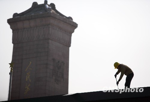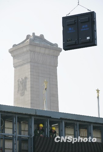 11月13日,位于天安門廣場的四塊巨型LED顯示屏開始拆除,這四塊LED顯示屏在完成建國六十周年大慶任務后走下了舞臺。據工作人員介紹,拆除工作從當日凌晨開始,全部移走要到下周一凌晨左右。中新社發 劉震 攝 轉自:http://news.cctv.com/china/200913/103984.shtml