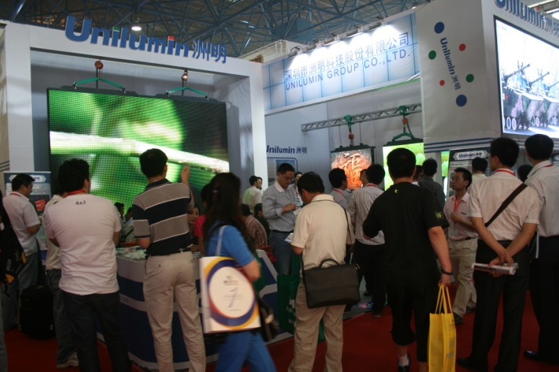 5月20日,展會乍一開始,洲明科技展示的各色全彩顯示屏就深深吸引了人們的眼球,令不少觀眾駐足觀看,流連忘返,一時間洲明展臺前人頭攢動,負責接待的工作人員更是應接不暇。展會現(xiàn)場,P6、P4兩種規(guī)格的顯示屏猶具吸引力,成功吸引部分客戶現(xiàn)場訂下意向訂單,并決定在展會結束后即到公司來考察。